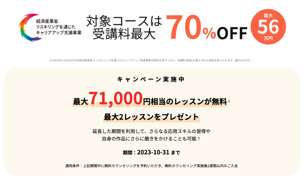 対象コースは70%(最大56万円)オフで受講可能。 -